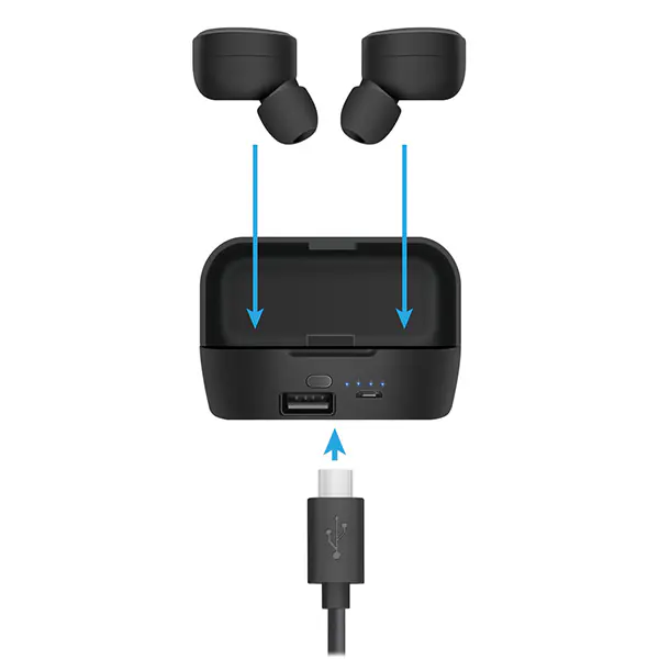 Na każdej słuchawce znajduje się wbudowany mikrofon oraz wielofunkcyjny przycisk sterowania, umożliwiający łatwe zarządzanie połączeniami i odtwarzaniem muzyki. W zestawie znajduje się również etui do przechowywania i ładowania o dużej pojemności 2000 mAh. Etui pełni podwójną funkcję, pozwalając nie tylko na szybkie naładowanie słuchawek, ale również może być używane jako powerbank do ładowania innych urządzeń, co czyni je niezwykle praktycznym akcesorium na co dzień.