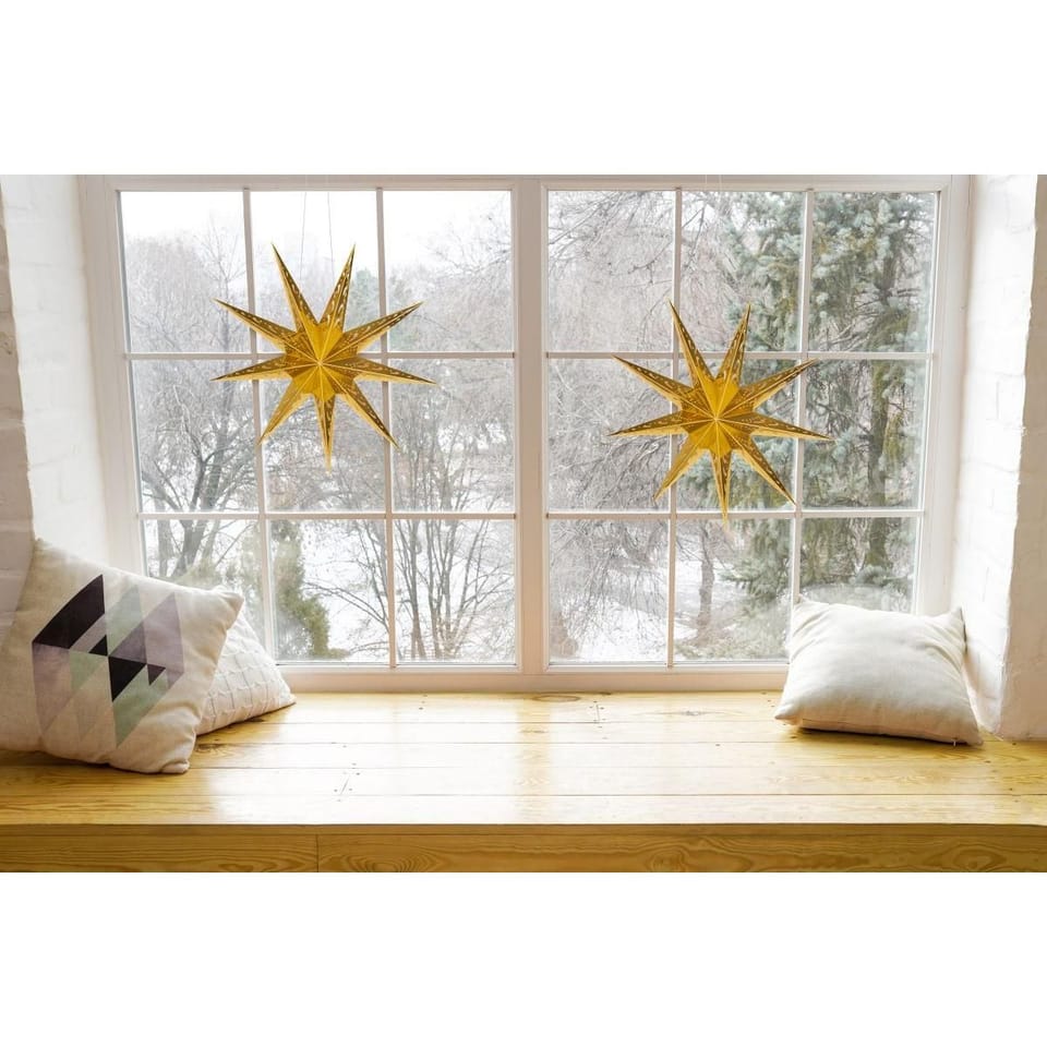 Dodaj swojemu domowi wyjątkowego blasku z naszą DEKORACJĄ PAPIEROWĄ GWIAZDĄ ŚR.45 CM 9 RAMION ZŁOTĄ, ta ozdoba wprowadzi do Twojego wnętrza elegancję i subtelny urok.