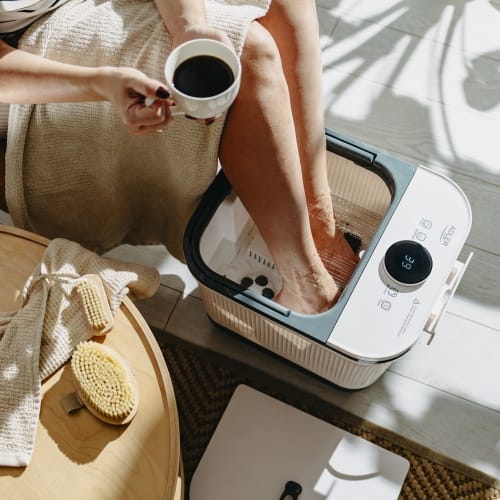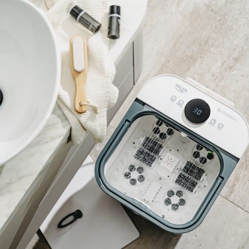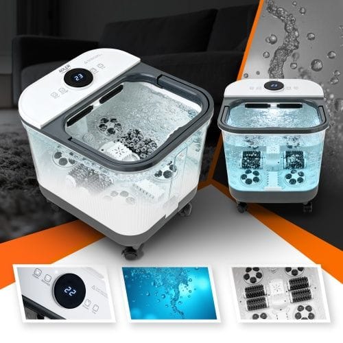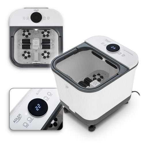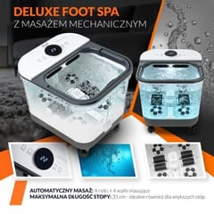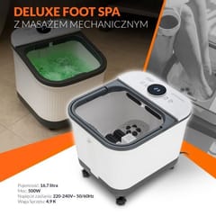 Delux hydromasażer do stóp z masażem mechanicznymAutomatyczny masaż przy pomocy 4 rolek i 4 wałków masującychMaksymalna długość stopy: 35 cmFunkcja kaskady wodnej z regulacją konta pluskaniaWbudowany pojemnik na sól Podgrzewanie wody do 48°CTimer 10-60 minutPokrywa zabezpieczająca przed chlapaniem i utratą temperaturyWygodny odpływ do odprowadzania wodyWbudowany zwijacz do przechowywania przewoduPodświetlany dotykowy panel kontrolny LEDErgonomiczna rączka do przenoszeniaKółka do łatwego przenoszenia urządzenia. Parametry techniczne:Pojemność: 16,7 litraMoc: 500WNapięcie zasilania: 220-240V~ 50/60HzWaga Sprzętu: 4,9 Kg