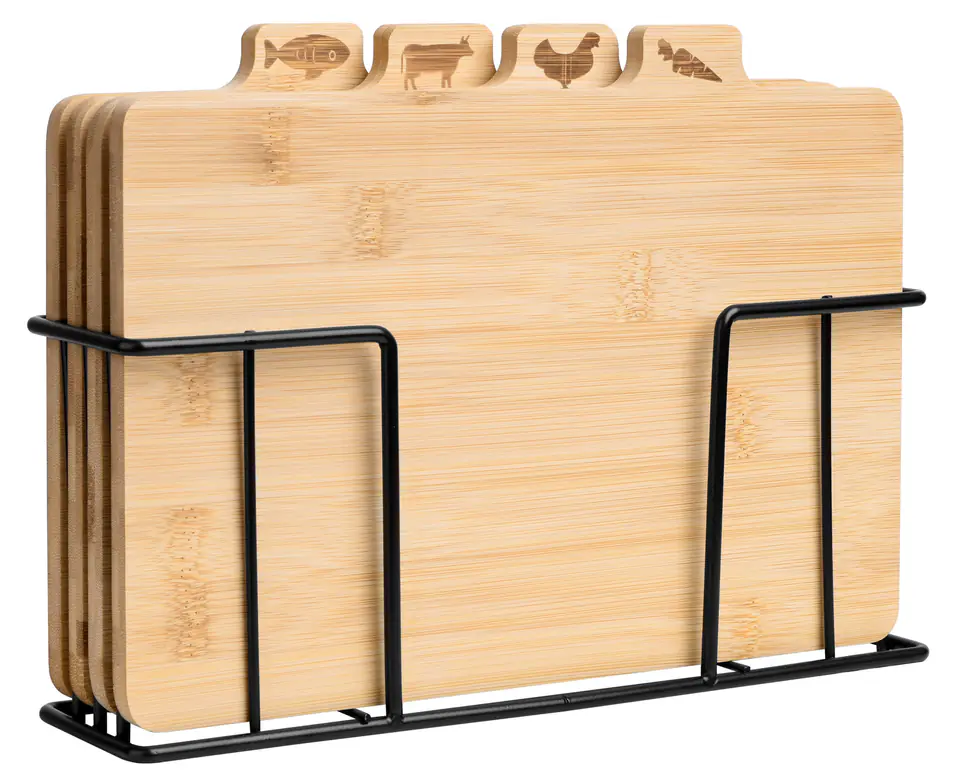 Deska do krojenia bambusowa Skara zestaw 4 sztukPrzeznaczenie: kuchnia | Kolor: naturalny Skara to praktyczny i elegancki zestaw desek bambusowych osadzonych na stalowym stojaku malowanym proszkowo na czarny kolor. Każda z desek ma swoje określone przeznaczenie. Deski służą do warzyw, drobiu, mięsa i ryb. Dzięki umieszczonym oznaczeniom będziesz mieć pewność, że używasz dedykowanej, prawidłowej deski. Komplet zajmuje mało miejsca, a każdą z desek będziesz mieć zawsze pod ręką. Zestaw zapewnia odpowiednią higienę przygotowywanych potraw. Deski wykonane są z naturalnego drewna bambusowego, dzięki czemu są odporne na wilgoć i odkształcenia, nie chłoną zapachów i szybko schną. Drewno bambusowe jest naturalnym materiałem ekologicznym, bezpiecznym dla zdrowia. SpecyfikacjaMateriał: drewno bambusowePrzeznaczenie desek: warzywa, drób, mięso, rybyMateriał stojaka: stal malowana proszkowoKolor stojaka: czarnyWaga: 1,75 kg Wymiarywymiary stojaka wraz z deskami szer. 29 cm x wys.21 cm x gł. 5,5 cmWymiary deski szer. 28 cm x wys. 20 cm/22 cm (z symbolem przeznaczenia) x grub. 0,8 cm ZaletyNajwyższa jakość materiałówElegancki praktyczny zestawEstetyczne i solidne wykonanieDeski na estetycznym czarnym stojakuDeski z naturalnego drewna bambusowegoKażda z desek oznaczona grafiką z przeznaczeniemHigieniczne przygotowywanie potrawOdporność na wilgoć i odkształceniaNie chłoną zapachówSzybko schnąBezpieczne dla zdrowiaZestaw zajmuje mało miejscaCiekawy pomysł na prezent Informacje dodatkowePrzedstawione kolory należy traktować poglądowo - mogą odbiegać od rzeczywistych ze względu na różne ustawienia monitorów oraz proces obróbki zdjęć. Rzeczywiste wymiary mogą się różnić od podanych wyżej. Tolerancja błędów może wynosić +/- 5%. Marka:GockowiakKod EAN:5902340326022Kolor:naturalnySzerokość deski: 28 cmDługość deski:20 cmMateriał:naturalny bambusMateriał stojaka:metalPrzeznaczenie:kuchnia, krojenie żywnościW zestawie:4 deski i metalowy koszyk/ stojak