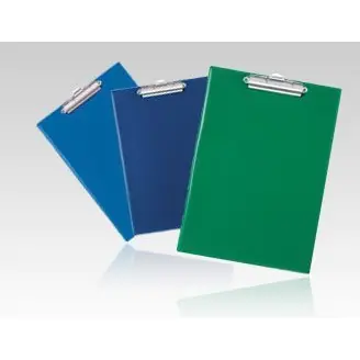 Wykonany z kolorowej folii PVC; środek usztywniony tekturą; wyposażony w sprężysty mechanizm zaciskowy służący do przytrzymywania kartek; podkładka pojedyncza; format A4;