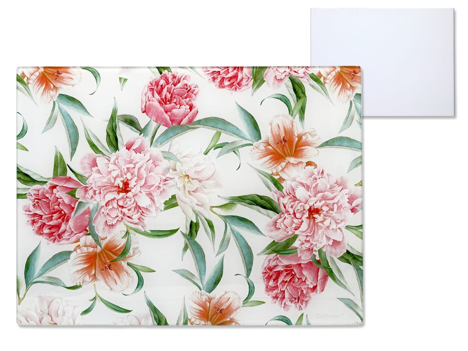 Gładka, błyszcząca tafla deski szklanej to doskonałe tło dla pięknych, kwiatowych dekoracji - bo kto powiedział, że produkty praktyczne, jak deska szklana nie mogę być piękne?