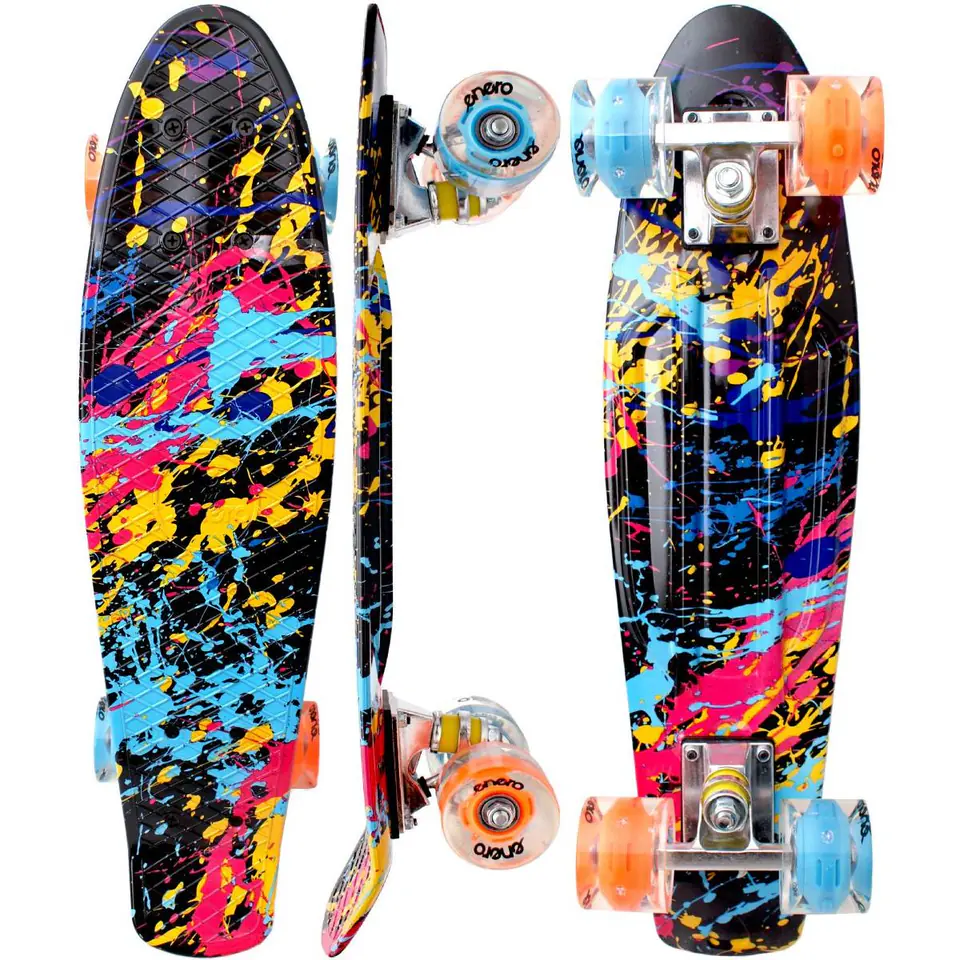 Jazda na deskorolce to sport indywidualny, który daje nie tylko frajdę, ale też poprawia sprawność fizyczną, pobudzając wszystkie mięśnie. Pozwala również, ćwiczyć wytrwałość i cierpliwość. DESKOROLKA GRAFFITI ENERO Z LAMPKAMI LED idealnie posłuży do rozpoczęcia przygody z tym rodzajem sportu oraz do nauki podstawowych trików. Potocznie tego rodzaju deskorolki nazywane są fiszkami. Ich nazwa pochodzi od angielskiego słowa „fish” oznaczającego rybę, z uwagi na ich charakterystyczny kształt i znane są na całym świecie