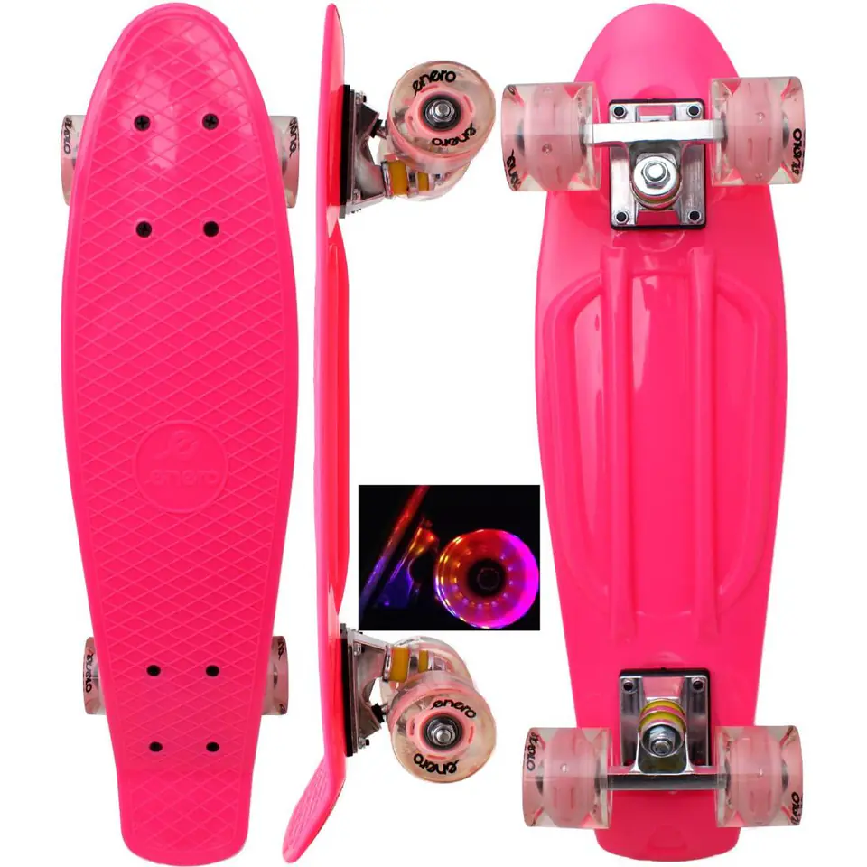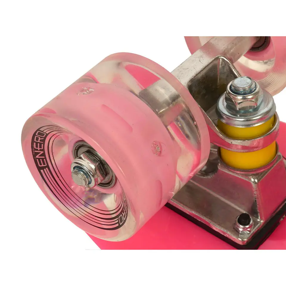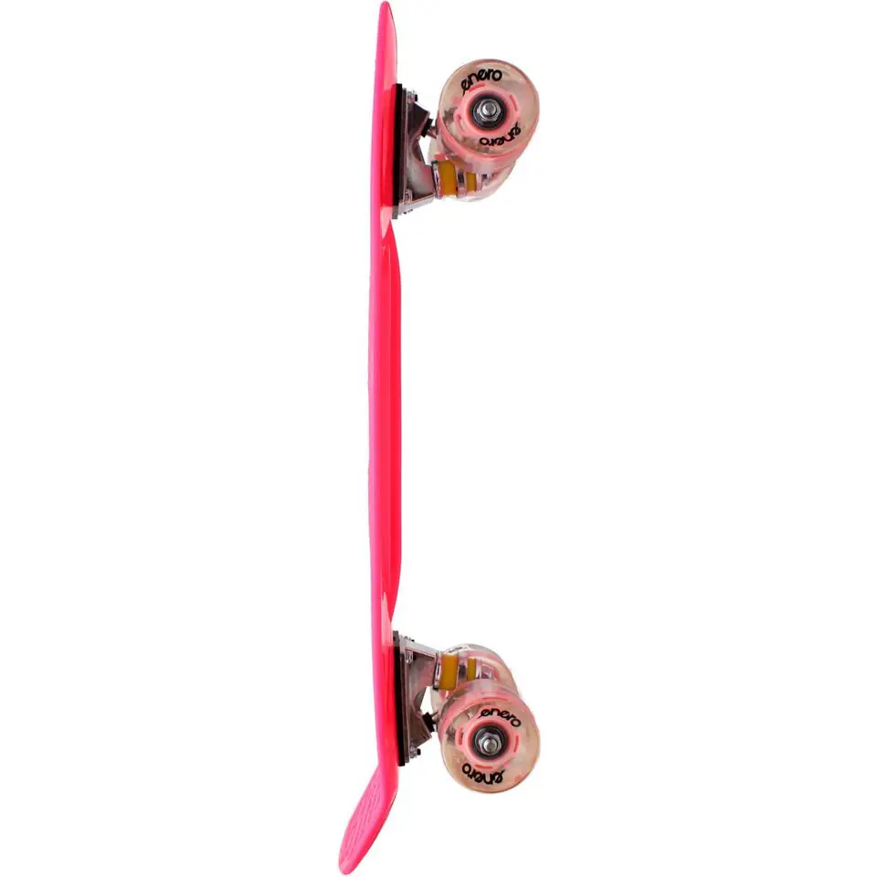 Zakup DESKOROLKI PLASTIKOWEJ 22 CALE ENERO RÓŻOWEJ LED to będzie bardzo dobry wybór. Deck wykonany z bardzo trwałego tworzywa sztucznego zapewni dużą wytrzymałość przy stosunkowo niewielkiej wadze.Górna antypoślizgowa powierzchnia zagwarantuje Twojemu dziecku dobrą przyczepność i stabilność, dzięki czemu nie straci kontroli podczas jazdy. Poliuretanowe miękkie kółka o twardości 82 A doskonale wyrównają nierówności podłoża, dobrze stłumią dźwięki i drgania, zapewnią bardzo dobre warunki do jazdy. Łożyska ABEC 7 pozwolą na płynną i szybką jazdę. Niewielkie rozmiary oraz waga pozwoli Twojemu dziecku na łatwe przechowywanie i transportowanie produktu. A świecące kółka z lampkami LED, nie tylko zwiększą widoczność i bezpieczeństwo Twojego dziecka ale też sprawią wielka frajdę podczas jazdy. Nie zwlekaj z zakupem, dołącz do grona szczęśliwych rodziców zadowolonych dzieci!!!