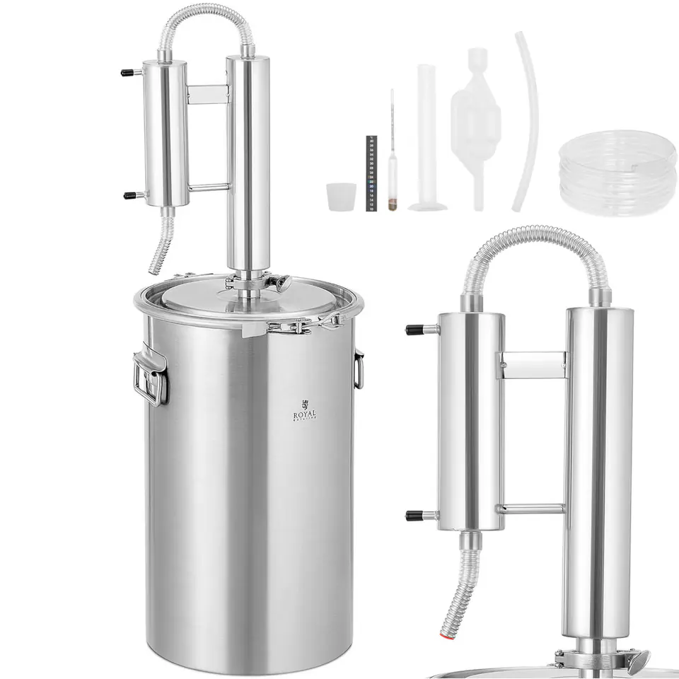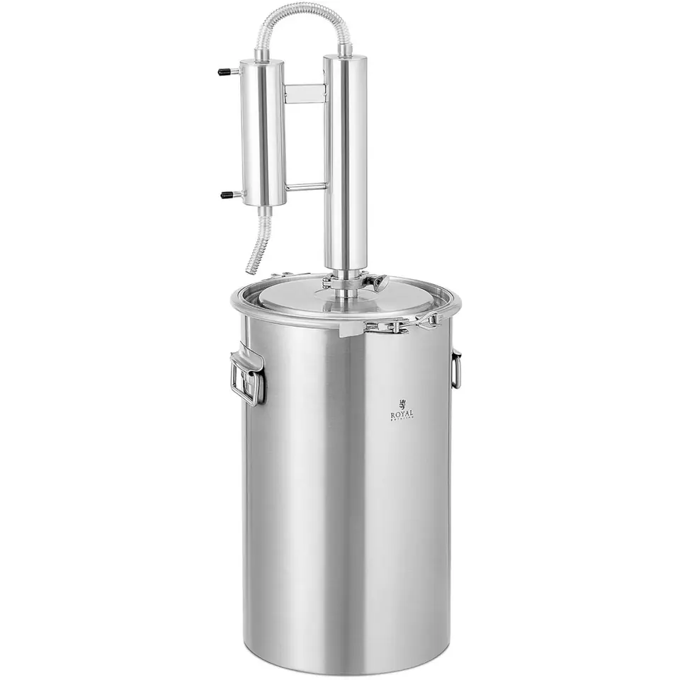 Destylator marki Royal Catering skutecznie oczyszcza wodę z soli, pierwiastków śladowych, mikroorganizmów, pozostałości wapna, ołowiu i innych zanieczyszczeń. Pozwala na wytworzenie olejków eterycznych a także perfum. Pojemność destylatora wynosi 35 l, średnica mierzy 300 mm. Do jego podgrzania można wykorzystać dowolne źródło ciepła, np. elektryczną płytę grzejną czy kuchenkę gazową. Urządzenie zawiera w komplecie wszystkie niezbędne węże i pojemniki potrzebne do efektywnego procesu destylacji. Poszczególne elementy: cylindry, przyłącza, podstawy można w szybki sposób połączyć ze sobą. Wąż chłodzący ma długość 1,5 m, zapewnia idealne rezultaty podczas destylacji wody, olejków czy innych substancji chemicznych. Dołączony alkoholomierz pozwala wiarygodnie określić zawartość alkoholu w destylowanej cieczy. Stal nierdzewna zastosowana w produkcie spełnia najwyższe standardy higieniczne, jest odporna na korozję i łatwa w czyszczeniu. Składane uchwyty umożliwiają bezpieczny transport i obsługę.
