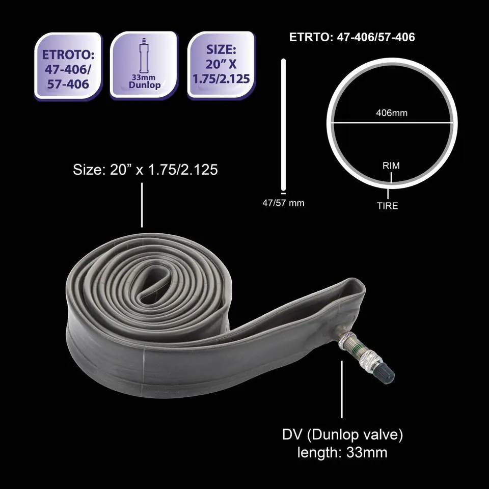 - łatwa w montażu i demontażuwykonana z dobrej jakości gumywyposażona w wentyl Dunlopv DV o wysokości 33 mmpasuje do koła 20 calirozmiar dętki w systemie ETRTO