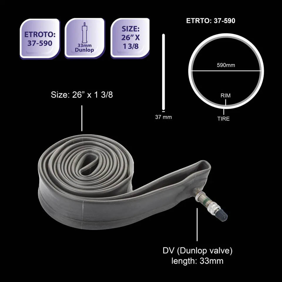 Parametry:- Materiał: kauczuk butylowyRozmiar: 26 cali 1,3/8ETRTO: 37 – 590Wentyl: DV (Dunlop) długość 33mmSamodzielny montaż: takKolor: czarnyWaga netto: 0,189 kgWaga brutto: 0,206 kg