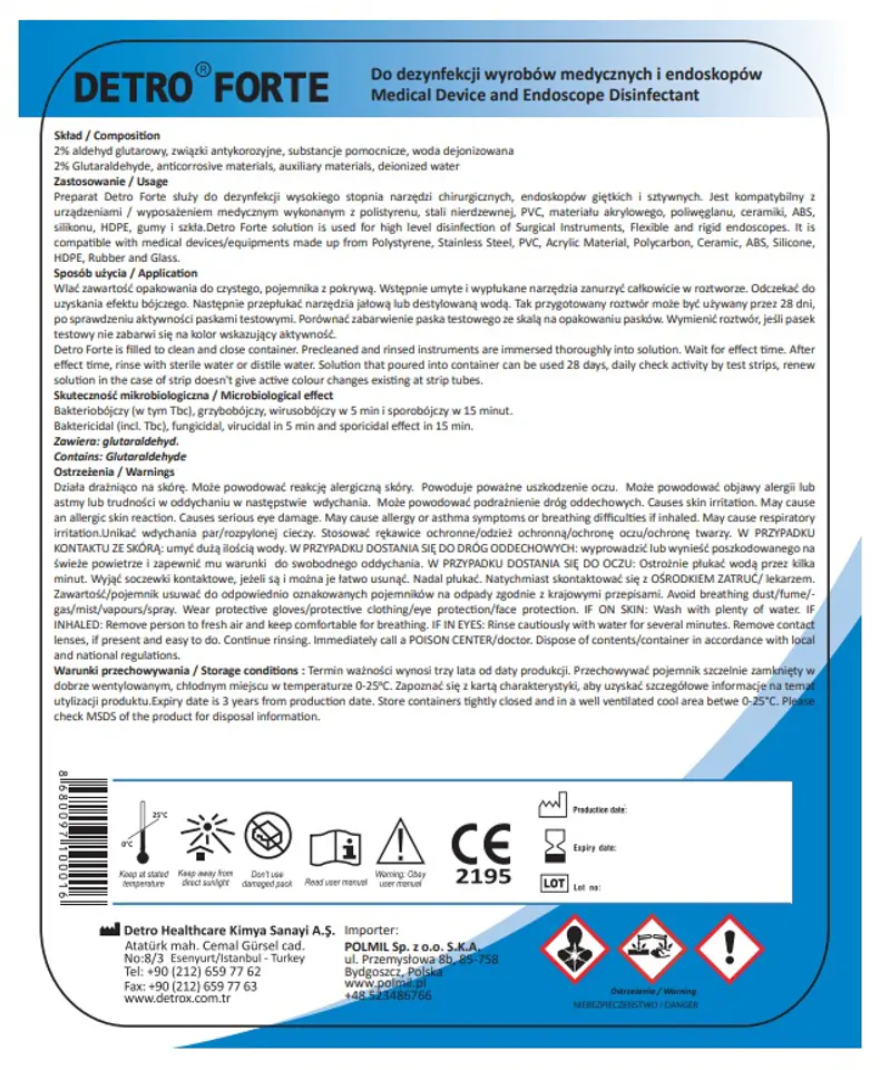 Środek do dezynfekcji narzędzi medycznych i endoskopów OBSZARY ZASTOSOWANIA: Dezynfekcja wysokiego stopnia narzędzi chirurgicznych oraz giętkich i sztywnych endoskopow Kompatybilny z wyrobami/urządzeniami medycznymi wykonanymi z polistyrenu stall hierdzewnej PCV, materiału akrylowego, poliweglanu, ćeramiki, ABS, silikonu HDPE gumy i szkła CHARAKTERYSTYKA PRODUKTU: Produkt gotowy do użycia Środek do dezynfekcji wysokiego stopnia Odpowiedni do mycia ręcznego oraz do stosowania w myjniach dezynfektorach do endoskopow markami endoskopów Zapobiega korozji narzędzi dzięki zawartości inhibitorów korozji kompatybilny z wszystkimi Aprobata producenta endoskopów, firmy KARL STORZ; wyrób medyczny - klasa llb. SKŁAD: 2% aldehyd glutarowy, materiały antykorozyjne, substancje pomocnicze SKUTECZNOŚĆ MIKROBIOLOGICZNA: Bakterie (w tym pratki gruźlicyl grzyby, wirusy w ciągu 5 minut. Spory w ciągu 15 minut. SPOSÓB UŻYCIA: Wlać preparat do czystego i zamykanego pojemnika. Przemyte i wypłukanie narzędzia zanurzyć cafkowicie w roztworze tak, aby nie wystawały żadne elementy. Zamknąc pojemnik. Odczekać do upływu czatu kontaktu. Wypłukać narzędzia w sterylnej lub destylowanej wodzie. Roztwór w pojemniku można stosować przez okres 28 dnl. Aktywność należy sprawdzać codziennie przy pomocy pasków testowych roztwór nalety sporządzić ponownie, jelli paski nie zabarwaje się na kolory wskazane na tubie. Paski testowe do zakupienia osobno.