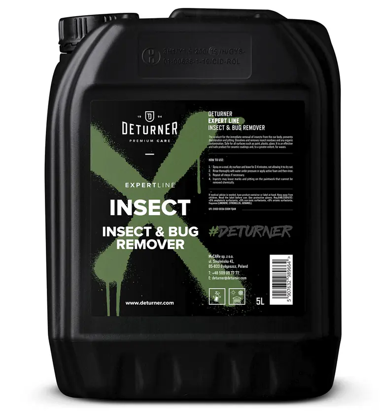 Deturner Expert Line Insect – produkt do natychmiastowego usuwania owadów z karoserii auta, zapobiega powstawaniu przebarwień oraz wżerów. Rozpuszcza i usuwa pozostałości po owadach oraz każde zanieczyszczenie organiczne. Bezpieczny dla wszystkich powierzchni takich jak lakier, plastik, szyby. Jest skutecznym oraz bezpiecznym preparatem dla powłok ceramicznych, oraz w większym stopniu dla wosków.