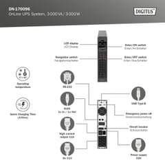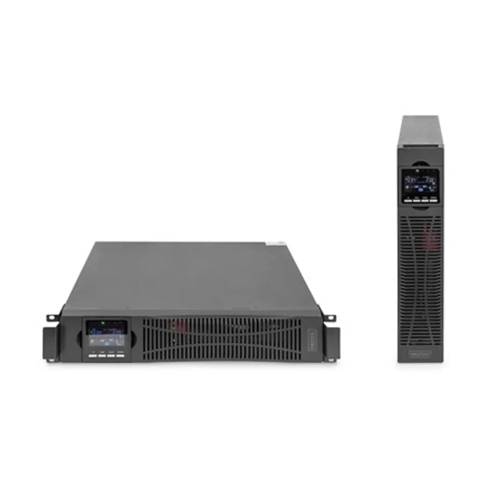 Systemy UPS OnLine firmy DIGITUS to wyjątkowo niezawodne rozwiązania, które zostały opracowane z myślą o ochronie wrażliwych urządzeń przed przerwami w dopływie prądu. Są one wyposażone w mikroprocesory sterujące dla zagwarantowania najwyższej wydajności i bezpieczeństwa systemów firmowych i biurowych użytkownika, a także ochrony przed utratą danych i ewentualnymi szkodami. Dzięki wysokiemu współczynnikowi mocy, szerokiemu zakresowi napięcia oraz wydajnej ładowarce system nadaje się również do zastosowań o wysokich wymaganiach. Inteligentne tryby ładowania i sterowania prędkością obrotową wentylatorów wydłużają żywotność i zwiększają niezawodność UPS. Za pomocą wyświetlacza LCD można skonfigurować wszystkie ustawienia parametrów tego zasilacza awaryjnego dla zapewnienia nieprzerwanego zasilania elektrycznego. Adapter SNMP do zdalnego dostępu do systemu UPS jest dostępny opcjonalnie.