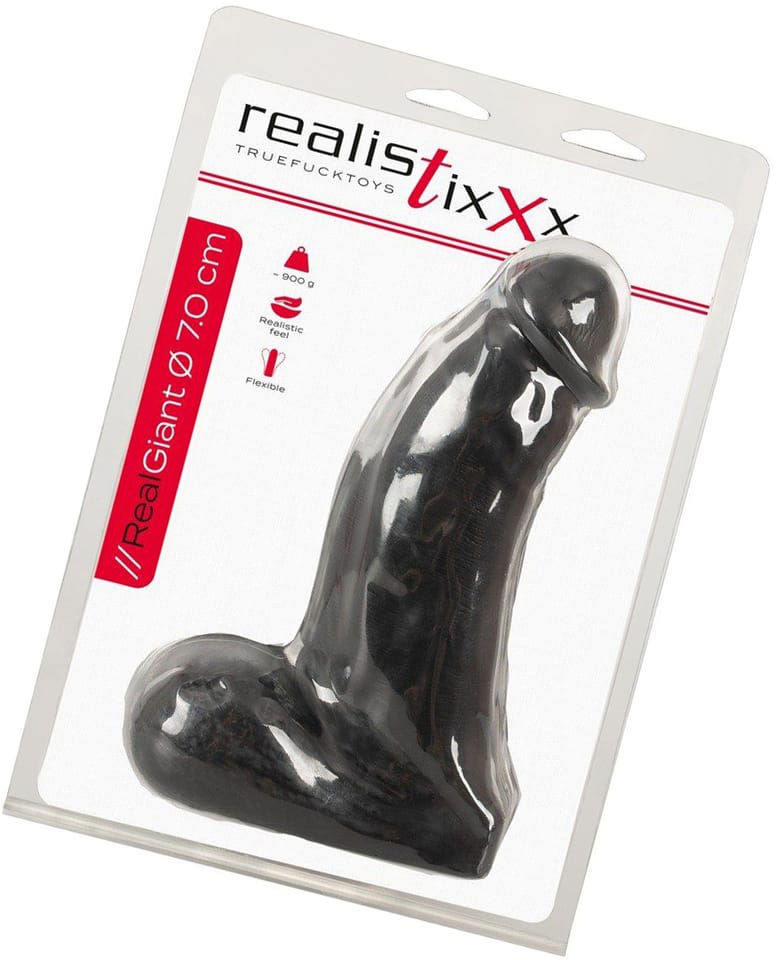 Gigantyczna przyjemność! Masywne, ale elastyczne dildo Real Giant od Realistixxx o wyglądzie penisa z lekkimi żyłkami i ukształtowaną żołędzią.