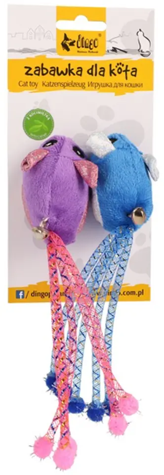 Dingo Zabawka dla kota - myszki Tota i UpekZabawka dla kota, dwie myszki Tota i Upek, jest wykonana z kolorowego i miękkiego materiału.Aby jeszcze skuteczniej pobudzać Twojego kota do zabawy myszki posiadają dzwoneczki przy podstawie ogonków. Ogonki wykonane są z elastycznych tasiemek z lśniącymi elementami.Zabawka składa się z dwóch myszek stworzonych z materiałów o różnych fakturach, dzięki czemu zapewnią Twojemu kotu wiele doznań. Przede wszystkim myszki będą zaspokajać naturalny instynkt łowiecki, który drzemie w Twoim kociaku!Dzięki zabawie myszkami koty rozwijają umiejętności i zmysły, a także rozładowują energię.Myszki zawierają kocimiętkę zachęcającą koty do zabawy!Wymiary myszek Tota i Upek: