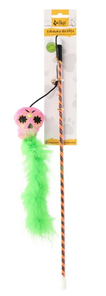 Dingo Zabawka dla kota - wędka UpiorekStrrasznie pobudzająca do zabawy wędka dla kota Upiorek!Z wędki na sznurku zwisa prawdziwy Upiorek! Jest wypełniony bezpiecznym materiałem, a sam jest strrrrasznie miękki i przyjemny w dotyku. Dzięki puchatym, zielonym piórom Upiorek zachęci do zabawy nawet najstraszniejszego kociego lenia.Twój kot pokocha wędkę z Upiorkiem, ponieważ będzie mógł wbić w niego pazury, a także ganiać za puchatym ogonkiem!Zabawka umili Ci czas spędzony wspólnie z kotem - dzięki wygodnemu i dobrze leżącemu w dłoni kijkowi będziesz czuł się komfortowo podczas zabaw.Wymiary wędki Upiorek: