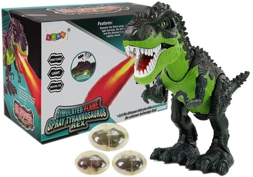 Tyranozaur Rex posiada dużą czaszkę, a także masywną, muskularną budowę, wielkie białe zęby. Cała długość dinozaura to aż 50 cm! Odcienie zieleni u dinozaura, łuski dodają realizmu. Produkt został wyposażony w głośnik, przez który słychać odgłosy imitujące dźwięki wydawane przez dinozaury. Zabawka porusza się w przód, rusza głową, paszczą i łapami oraz zieje ogniem! Przy pomocy kroplomierze na głowie dinozaura wlewamy wodę, a podczas zabawy będziemy mogli zobaczyć, jak wydobywa się z paszczy para wodna z czerwonym światłem. Następną zaletą to znoszenie jaj! Na grzbiecie znajduje się otwór, gdzie wrzucamy jaja, a one wylatują od spodu, imitując prawdziwe znoszenie jaj. W zestawie 3 sztuki. Twój dinozaur może powiększyć rodzinę!