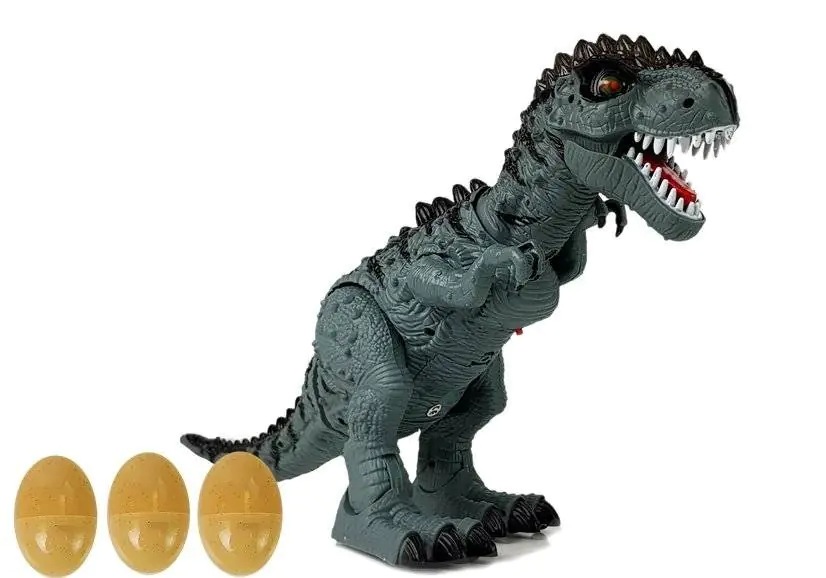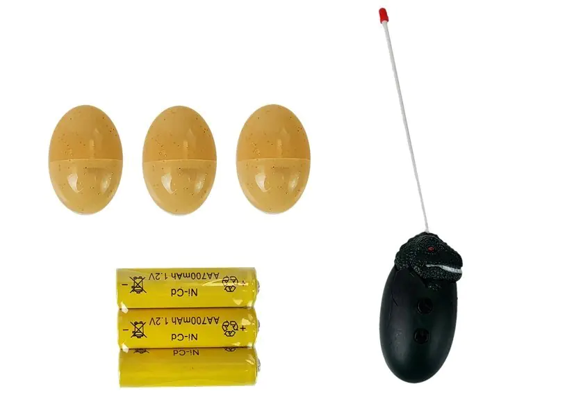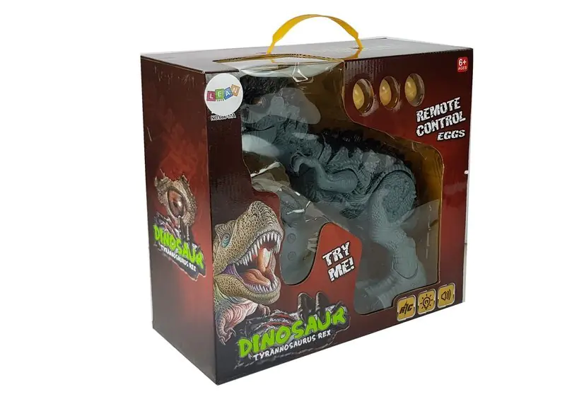 Tyranozaur Rex posiada dużą czaszkę, a także masywną, muskularną budowę, wielkie białe zęby. Cała długość dinozaura to aż 54 cm! Jego kolorystyka szara z elementami czarnego i struktura idealnie przypomina prawdziwego dinozaura. Dodatkowego efektu daje świecące łuski na głowie dinozaura w różnych kolorach, zamontowany projektor ze zdjęciem prawdziwego tyranozaura daje odczucie jeszcze bardziej realistyczne. Produkt został wyposażony w głośnik, przez który słychać odgłosy imitujące dźwięki wydawane przez dinozaury. Pilot do sterowania przedstawiający dinozaura wykluwającego się z jaja, ciekawie wygląda i prezentuje się na półce małego odkrywcy prehistorycznych stworzeń. Podczas sterowania dinozaur porusza się w przód, rusza głową, paszczą i łapami. Następną zaletą to znoszenie jaj! Na grzbiecie znajduje się otwór, gdzie wrzucamy jaja, a one wylatują od spodu, imitując prawdziwe znoszenie jaj. W zestawie 3 sztuki. Twój dinozaur może powiększyć rodzinę! Zabawa potęguję niecodzienne wrażenia oraz na pewno zainteresuje malucha do pogłębiania wiedzy na temat tych wielkich gadów.