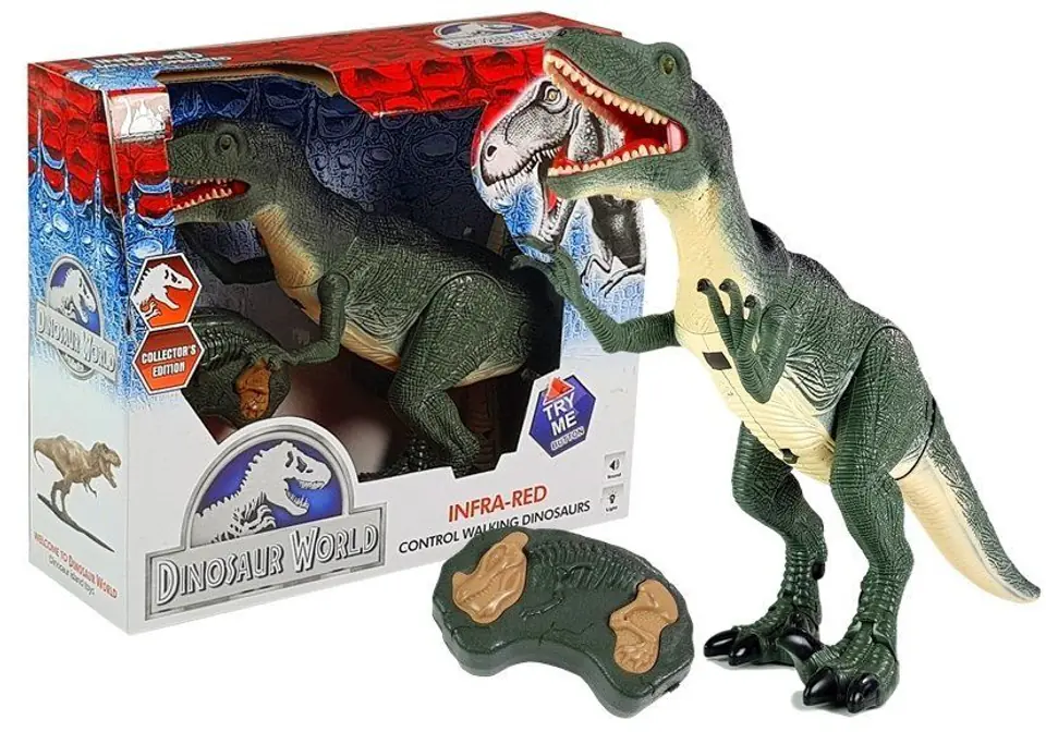 Dinozaur posiada opcję zdalnego Sterowania. Dołączony do zestawu pilot posiada dwa aktywne przyciski. Przyciskiem po lewej stronie uruchamiamy dźwięki oraz ruszanie głową. Drugi przycisk to poruszanie się dinozaura do przodu. Pilot zasilany jest bateriami 3xAA- Brak w zestawie.