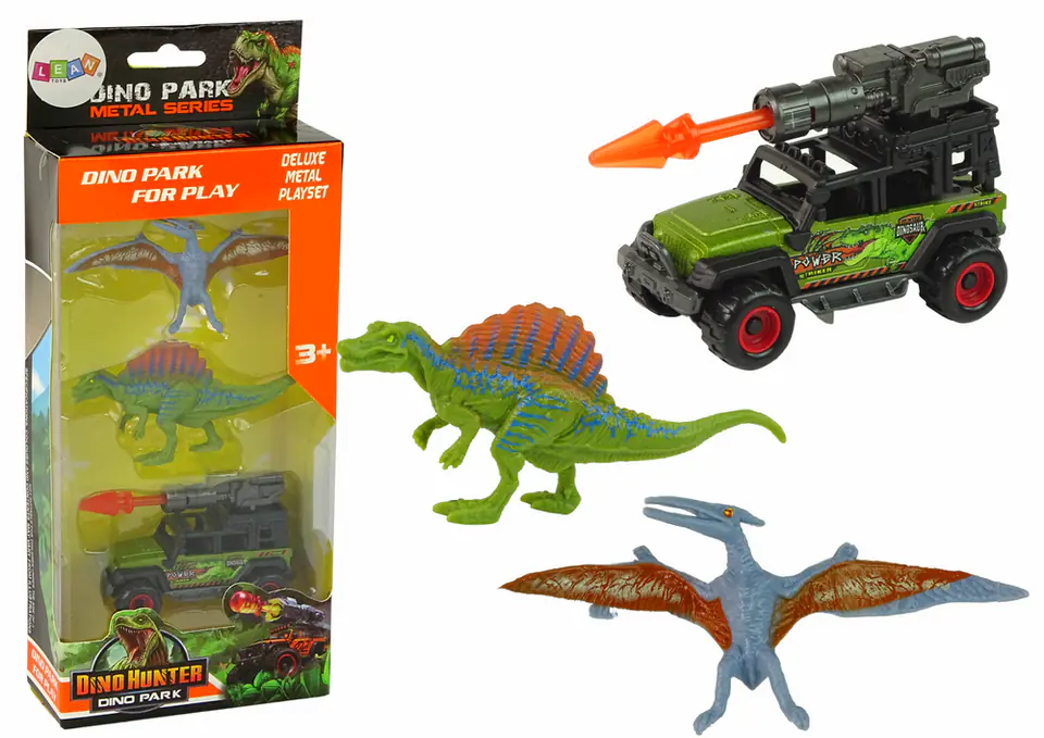 Spinozaur jest zielony z pomarańczową grzywą. To imponujący dinozaur drapieżny, Jego ciało jest zielone, a charakterystyczną cechą jest pomarańczowa grzywa na grzbiecie, która dodaje mu wyjątkowego uroku. Ma długi ogon, który nadaje mu drapieżności i uwydatnia jego prehistoryczny charakter. Pojazd terenowy jest nowoczesny i gotowy do przygód w poszukiwaniu dinozaurów.