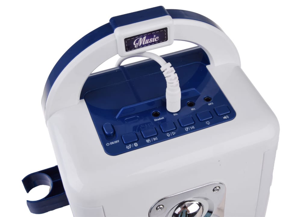 Przenośny, muzyczny głośnik z mikrofonem to nie lada gratka dla każdego małego DJ-a! Zabawka wyposażona w mikrofon, światła disco, uchwyt do przenoszenia oraz nietuzinkowy dizajn - wszystko to, co wymaga taki sprzęt. Głośnik zasilany 4 bateriami 1,5 V AA bez problemu można zabrać ze sobą do ogrodu, na plac zabaw, czy po prostu do koleżanki, kolegi i urządzić wyśmienitą dyskotekę.