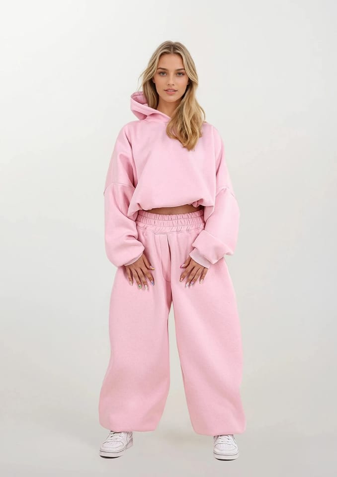 Bluza została zaprojektowana w nowoczesnym kroju cropped, który doskonale wpisuje się w aktualne trendy modowe. Luźniejszy fason nadaje całości swobodnego charakteru, a praktyczny kaptur zapewnia dodatkowy komfort w chłodniejsze dni. Elastyczne wykończenia sprawiają, że bluza świetnie układa się na ciele i pasuje do wielu stylizacji – możesz nosić ją zarówno w komplecie ze spodniami, jak i zestawić z ulubionymi jeansami czy legginsami.