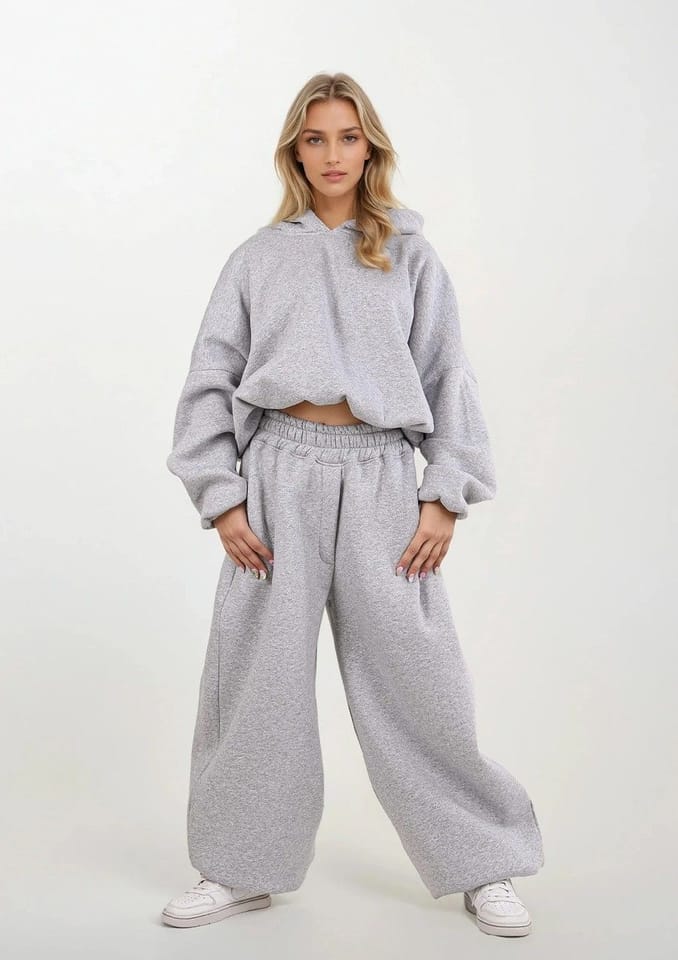 Dopełnieniem kompletu są spodnie o szerokich, wygodnych nogawkach zakończonych ściągaczem przy kostce. Taki krój gwarantuje maksymalną swobodę ruchów, jednocześnie zachowując modny i zgrabny wygląd. Wysoki stan oraz elastyczna talia pozwalają dopasować spodnie do sylwetki, podkreślając jej atuty i zapewniając wygodę przez cały dzień.