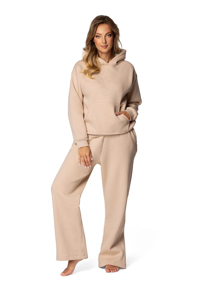 Dres składa się ze spodni o szerokich nogawkach, które zapewniają swobodę ruchu, oraz bluzy kangurki z praktycznymi kieszonkami. Spodnie są wyposażone w elastyczną gumkę w pasie, co sprawia, że idealnie dopasowują się do sylwetki i zapewniają wygodę przez cały dzień. Bluza kangurka, z charakterystyczną przednią kieszenią, jest idealna do ogrzewania rąk lub przechowywania drobnych przedmiotów.