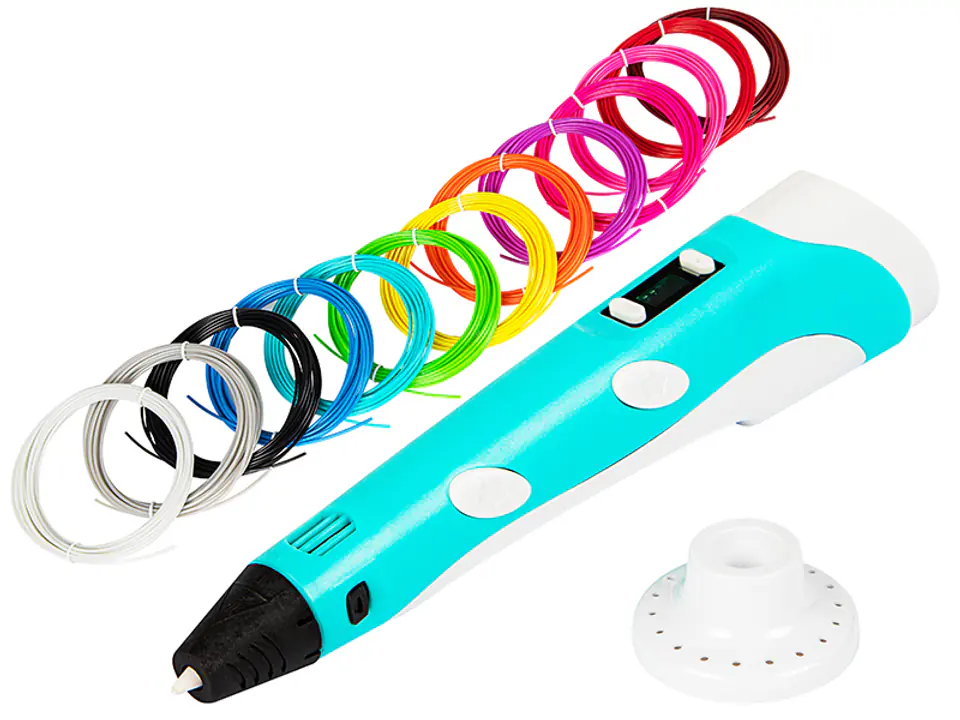 SPOSÓB UŻYCIAWepnij zasilacz do gniazdka i podłącz go do urządzenia. Żółta lampka LED zaświeci się, informując, że urządzenie jest gotowe i w trybie oczekiwania.Na wyświetlaczu LCD wybierz „PLA" lub „ABS", tak aby informacje były zgodnie z wykorzystywanym materiałem.Przytrzymaj przycisk ładowania filamentu do momentu, w którym czerwona lampka LED zmieni kolor na niebieski. Oznacza to, że wstępne ogrzewanie zostało zakończone i urządzenie jest gotowe do pracy.Włóż filament do odpowiedniego otworu i dwukrotnie wciśnij przycisk ładowania filamentu. Tworzywo przesuwane jest przy użyciu silniczka, gdy z dyszy zacznie wstawać filament, oznacza to, że został załadowany poprawnie. Teraz, aby wysunąć tworzywo należy wciskać przycisk ładowania filamentu.Zacznij tworzyć! Możesz regulować prędkość podawania tworzywa za pomocą regulatora prędkości.Filament z tego samego tworzywo, ale w różnych kolorach posiadać może różną optymalną temperaturę topnienia. Należy więc za pomocą przycisków regulacji temperatury dokonać precyzyjnych nastaw.Nie wolno dotykać dyszy podczas pracy urządzenia, gdyż jest ona bardzo gorąca.Gdy urządzenie nie będzie używane przez 5 minut, automatycznie przejdzie w tryb uśpienia. Aby przywrócić je do pracy, należy wcisnąć przycisk ładowania filamentu.Aby rozładować filament, należy przytrzymać przycisk wyładowania filamentu, do momentu, aż cały filament zostanie wyjęty z urządzenia.Po zakończeniu zabawy należy zużyć załadowany filament lub wyjąćPrzejrzysty wyświetlacz LEDNa w naszym urządzeniu na wyświetlaczu LED wybierasz z jakich wkładów korzystasz - PLA czy ABS. Możesz także regulować temperaturę topnienia wkładów.Dzięki takiemu uproszczeniu korzystanie z naszego długopisu jest bardzo wygodne.Szybka i prosta zmiana prędkości działaniaSuwak zamontowany w naszym urządzeniu pozwala na dostosowanie prędkości filamentu w każdej chwili. Dzięki takiemu rozwiązaniu będziesz mógł tworzyć w swoim własnym tempie, co pozwoli na tworzenie bardzo dokładnych rysunków czy figurek.
