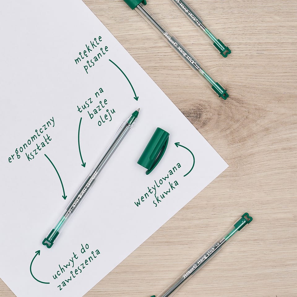 Długopis Pelikan Hang Stick to praktyczne i niezawodne narzędzie do codziennego pisania, które łączy wygodę użytkowania z funkcjonalnymi detalami. Dzięki ergonomicznemu kształtowi o przekroju zbliżonym do trójkąta, idealnie dopasowuje się do dłoni, zapewniając komfort nawet podczas długiego pisania. Tusz na bazie oleju gwarantuje miękki i płynny ruch po papierze. Co go wyróżnia? Specjalny uchwyt na końcówce, który umożliwia zawieszenie długopisu lub przymocowanie go do wybranego przedmiotu – idealne rozwiązanie dla miejsc, gdzie pisak powinien być zawsze na swoim miejscu. Wentylowana skuwka zwiększa bezpieczeństwo, a jednorazowa konstrukcja sprawia, że jest gotowy do użycia i nie wymaga wymiany wkładów.Cechy główne