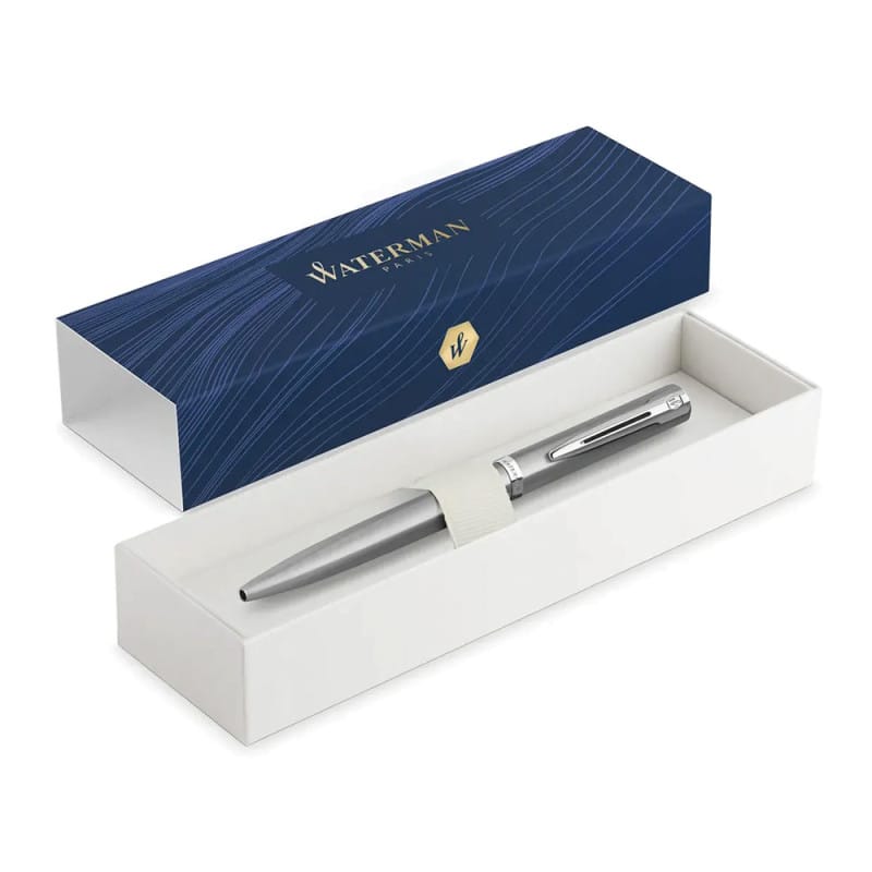 Stalowy długopis nie musi kojarzyć się z chłodnym, technicznym narzędziem. W modelu Impression CT marka Waterman pokazuje zupełnie inne podejście do tego materiału – spokojne, eleganckie i wyważone. To propozycja dla osób, które cenią neutralny design, ale oczekują od przedmiotów codziennego użytku jakości i dopracowania widocznego w detalach.Korpus wykonany ze stali prezentuje się lekko i czysto. Powierzchnia subtelnie odbija światło, tworząc delikatne refleksy, które nadają całości głębi bez efektu nadmiernego połysku. Chromowane wykończenia zostały dobrane w taki sposób, by współgrały z całą bryłą, nie dominując formy. Dzięki temu długopis zachowuje uniwersalny charakter i dobrze wpisuje się zarówno w przestrzeń biurową, jak i domowe miejsce pracy.