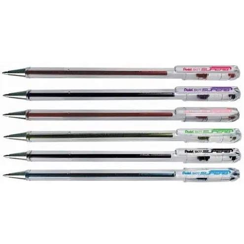 Klasyczny i bardzo popularny dlugopis Pentel BK77 SuperB, slynący ze swojej niezawodności. Gladko pisze, nie przerywa, nie brudzi i nie pozostawia kleksów. Posiada bardzo dlugą linie pisania wynoszącą prawie 2 km. Przezroczysta obudowa. Nasadka posiada silikonową kulke zabezpieczającą wklad przed wysychaniem. Koncówka 0,7mm wykonana z niklowanego srebra. Idealny do codziennego pisania i bazgrania.