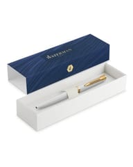 KORPUS: Stal szlachetna pokryta błyszczącym białym lakierem. NASADKA (SKUWKA): Stal szlachetna pokryta błyszczącym białym lakierem, pasuje stylistycznie do korpusu. KLIPS: Charakterystyczny, rozdwojony klips Waterman z pozłacaną powłoką. WYKOŃCZENIA (GT): Detale pokryte złotą powłoką, w tym szeroki pierścień na nasadce z grawerem Waterman. MECHANIZM: Gładko działający mechanizm obrotowy uruchamiający wkład jednym ruchem. KOŃCÓWKA PISZĄCA: Precyzyjna końcówka typu medium, szybkoschnący atrament, wyraźna linia. ATRAMENT: Kolor niebieski. MOCOWANIE WKŁADU: Wkład długopisowy Waterman – standard wymienny. MONTAŻ / PRODUKCJA: Ręcznie składany we Francji, w oparciu o ponad 140-letnie rzemiosło marki Waterman.