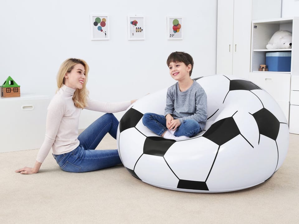 Ciekawy wzór z pewnością przykuje uwagę każdego małego kibica. Od teraz oglądanie ulubionych meczy będzie jeszcze przyjemniejsze. Wygodny fotel z oparciem zapewni chwilę relaksu najmłodszym, idealnie sprawdzi się też podczas nauki, bądź czytania książek na tarasie. Konstrukcja fotela zapewni maksymalny komfort, niezależnie od tego, jaką pozycję się w nim przyjmie. Ponadto doskonale nadaje się do użytku w pomieszczeniach i na zewnątrz. Jest stworzony z wytrzymałego materiału PVC, dzięki czemu nie będziesz musiał martwić się o uszkodzenia. Dołączona do zestawu łatka naprawcza zagwarantuje Ci dodatkową ochronę przed niechcianymi uszkodzeniami.