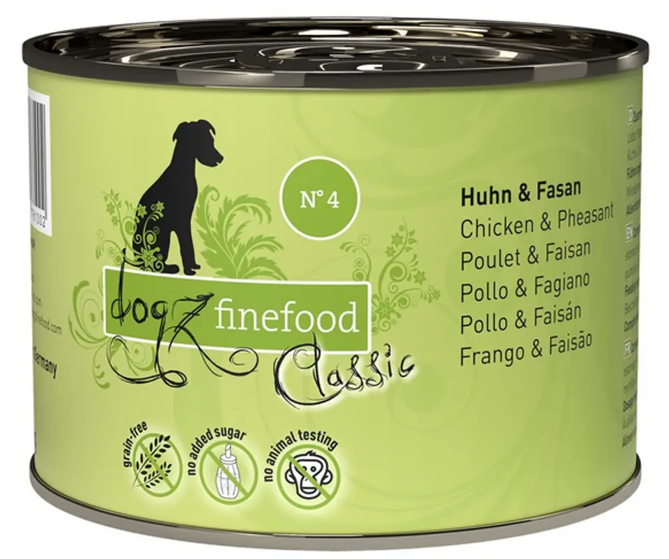 Specjał dla psów – wartościowa karma dla naszych pupili. Dogz Finefood zawiera dużo mięsa i wartościowe dodatki. Bez konserwantów, barwników i wzmacniaczy smaku. Nie zawiera GMO.Skład:Kurczak 50% (tkanka mięśniowa, serce, wątroba, żołądek i szyja), woda pitna 25,7%, bażant 15% (tkanka mięśniowa serca, wątroba), komosa ryżowa 3% dynia 3%, jagody 2%, minerały 1%, olej rzepakowy 0,2%, rzeżucha 0,1%Składniki analityczne:Białko 10,9%, zawartość tłuszczu 6,8%, popiół surowy 2,1%, włókno surowe 0,4%, wilgotność 76%Dodatki dietetyczne na 1 kg:Witamina D3 200 IE, cynk 25 mg, mangan 1,4 mg, miedź 1 mg, jod 0,75 mgZalecana dzienna ilość/zapotrzebowanie:Dzienna porcja powinna wynosić ok. 3-5% masy ciała.