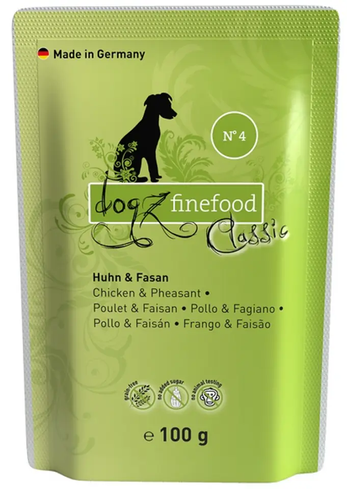 Specjał dla psów – wartościowa karma dla naszych pupili. Dogz Finefood zawiera dużo mięsa i wartościowe dodatki. Bez konserwantów, barwników i wzmacniaczy smaku. Nie zawiera GMO.Skład:Kurczak 50% (tkanka mięśniowa, serce, wątroba, żołądek i szyja), woda pitna 25,7%, bażant 15% (tkanka mięśniowa serca, wątroba), komosa ryżowa 3% dynia 3%, jagody 2%, minerały 1%, olej rzepakowy 0,2%, rzeżucha 0,1%Składniki analityczne:Białko 10,9%, zawartość tłuszczu 6,8%, popiół surowy 2,1%, włókno surowe 0,4%, wilgotność 76%Dodatki dietetyczne na 1 kg:Witamina D3 200 IE, cynk 25 mg, mangan 1,4 mg, miedź 1 mg, jod 0,75 mgZalecana dzienna ilość/zapotrzebowanie:Dzienna porcja powinna wynosić ok. 3-5% masy ciała.
