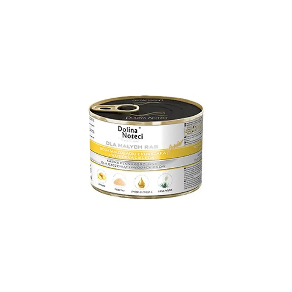 Karma pełnoporcjowa dla szczeniąt i młodych psów małych ras bogata w żołądki z kurczaka z wątróbką cielęcą 185 g