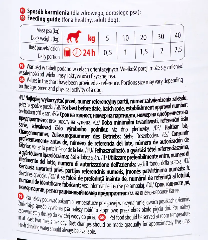 Wartości w tabeli są orientacyjne - wielkość porcji może się zmienić w zależności od pory roku, wieku, kondycji i aktywności fizycznej psa.
