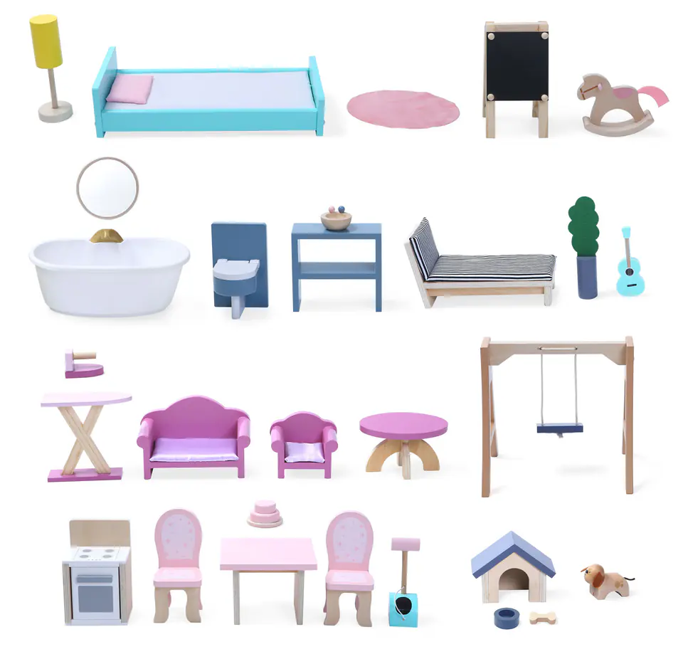 Zestaw obejmuje również komplet 28 drewnianych mebli, oraz innych przedmiotów takich jak odkurzacz, gitara, lustro czy też buda dla pasa. Wszystkie elementy można dowolnie wyjmować i przestawiać bez żadnych ograniczeń.