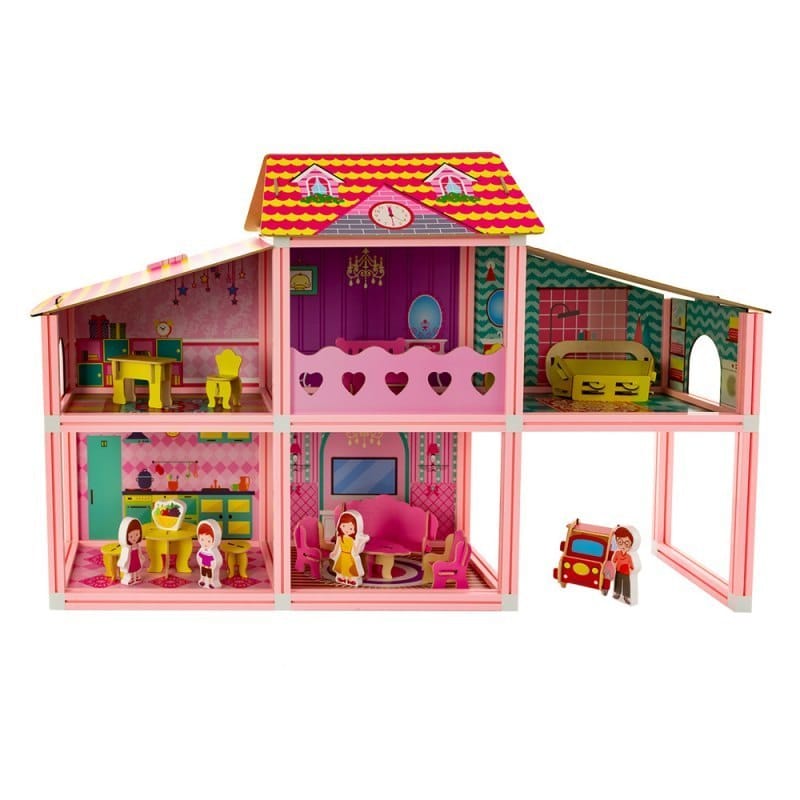 Domek dla lalek z akcesoriami. Model posiada łatwą do złożenia plastikową konstrukcję z możliwością dowolnego łączenia. Domek posiada na wyposażeniu drewniane meble, ściany oraz podłogi. Do zestawu dołączone są drewniane figurki. Zawartość zestawu: - figurki 4x - misa z owocami 1x - meble drewniane 10x - samochód 1x Wymiary produktu: 89x23x55 cm Wymiary opakowania: 57x40x7 cm Wiek dziecka: 36m+