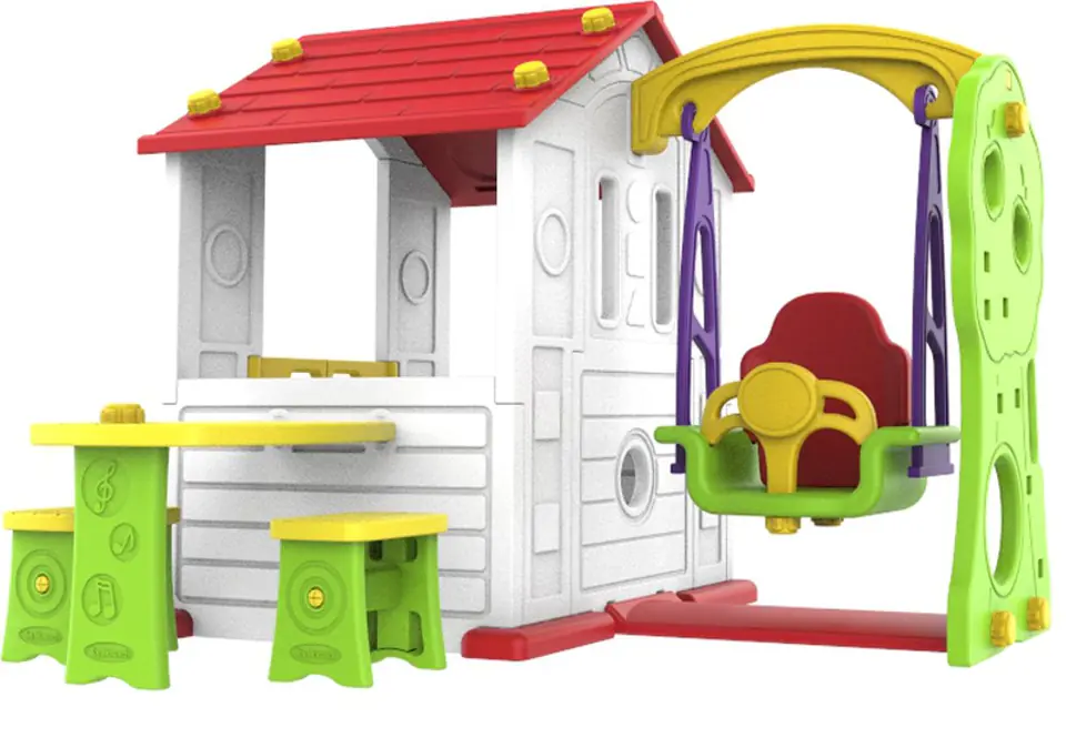 | duża przestrzeń wewnątrz domku zapewniająca swobodę zabawy, duże otwierane na oścież drzwiczki, bezpieczna dwuwarstwowa huśtawka, bezpieczna dwuwarstwowa konstrukcja stolika i krzeseł konstrukcja pozwala na demontaż ogródka i dobudowanie ścianki domku. | |