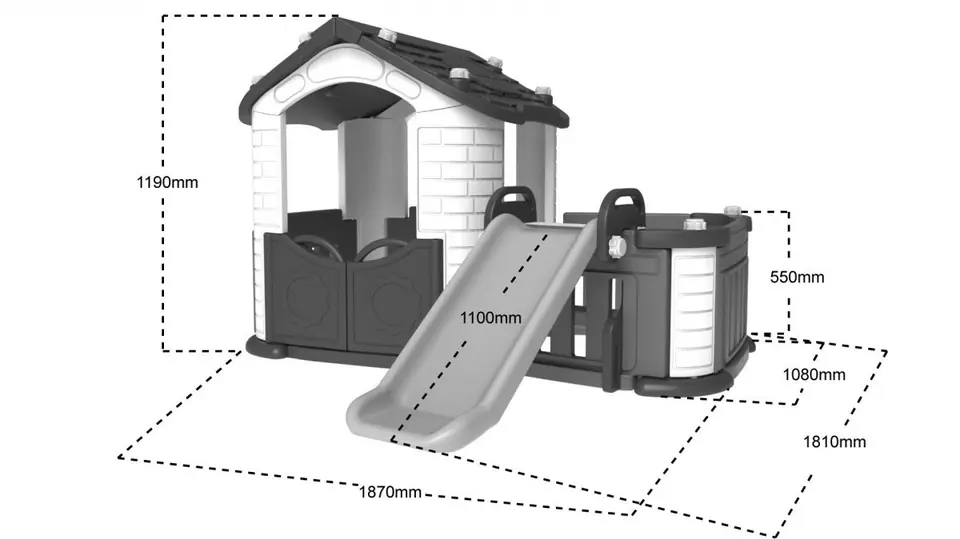 wysokość domku 119 cm, długość całkowita 187 cm, szerokość domku 108 cm, szerokość ze zjeżdżalnią 181 cm, rozmiary ślizgu zjeżdżalni 110 x 38 cm, wysokość płotka 55 cm, rozmiar okien 50 x 40 cm, wymiary wewnętrzne ogródka 70 x 95 cm, rozmiary wejścia 50 x 97 cm, waga domku 24 kg, wymiary opakowania 135x48,5x72,5 waga 27,5kg