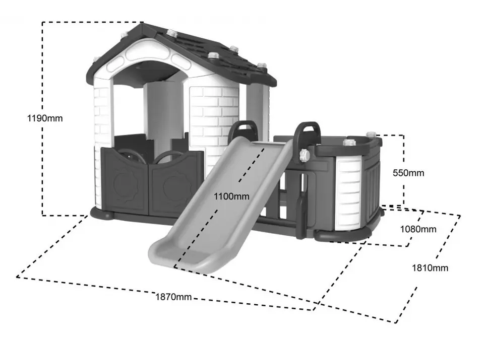 wysokość domku 119 cm, długość całkowita 187 cm, szerokość domku 108 cm, szerokość ze zjeżdżalnią 181 cm, rozmiary ślizgu zjeżdżalni 110 x 38 cm, wysokość płotka 55 cm, rozmiar okien 50 x 40 cm, wymiary wewnętrzne ogródka 70 x 95 cm, rozmiary wejścia 50 x 97 cm, waga domku 24 kg, wymiary opakowania 135x48,5x72,5 waga 27,5kg