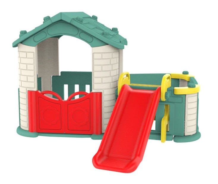 duża przestrzeń wewnątrz domku zapewniająca swobodę zabawy, duże otwierane na oścież drzwiczki, bezpieczna dwuwarstwowa zjeżdżalnia, szerokie wytrzymałe stopnie zjeżdżalni, zabudowany przedsionek z przejściem do domku, wewnątrz ogrodzonego płotkiem ogródka znajdziemy schodki do zjeżdżalni, konstrukcja pozwala na demontaż ogródka i dobudowanie ścianki domku.