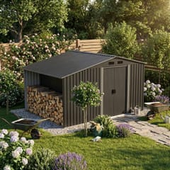 Połączenie domku narzędziowego i drewutni pozwala przechowywać wszystko w jednym miejscu. Drewno ma suche schronienie, a narzędzia są bezpieczne i uporządkowane. To wygodne rozwiązanie dla ogrodów o każdej wielkości.