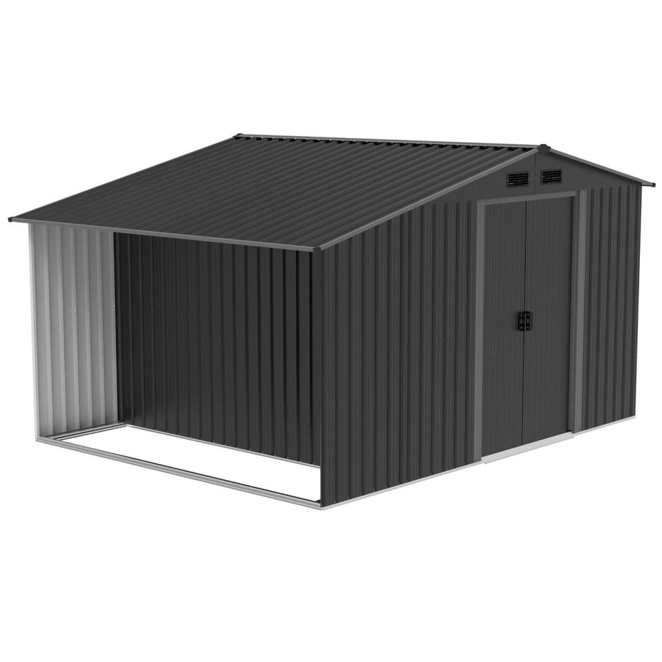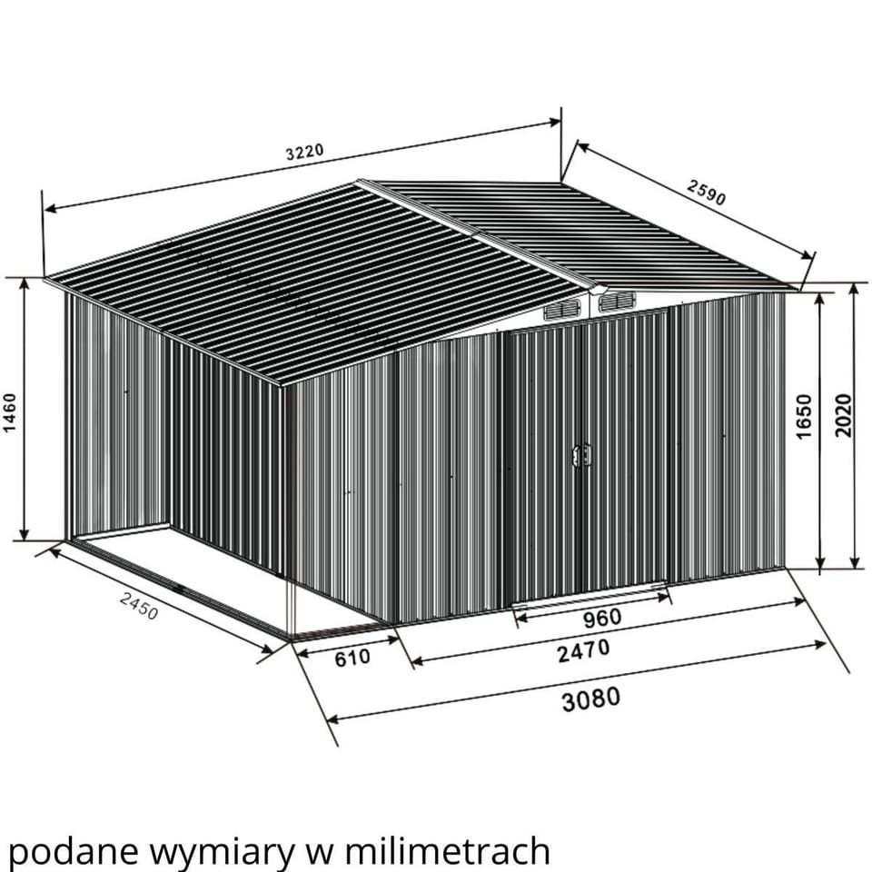 Wymiary 308 × 245 × 202 cm oferują dużo miejsca na sprzęty: kosiarkę, rowery, narzędzia i akcesoria ogrodowe. Wysokość pozwala komfortowo poruszać się wewnątrz. Idealny do ogrodów domowych i działek.