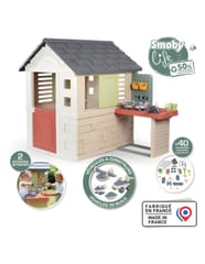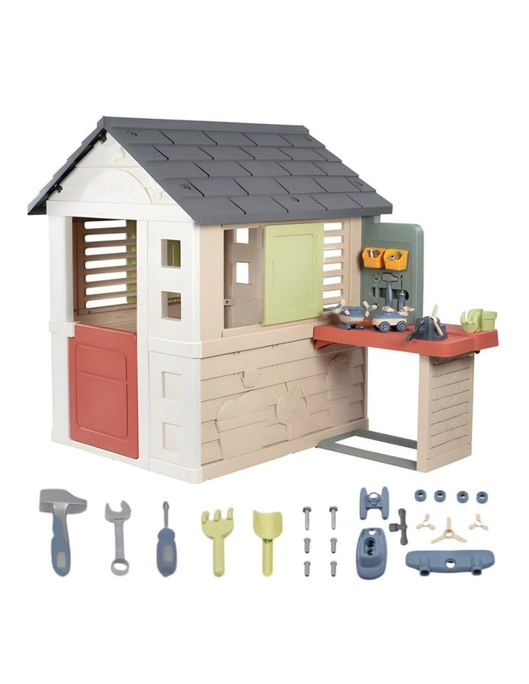 Smoby Life Domek z warsztatem \nDomek z warsztatem małego majsterkowicza. 39 akcesoriów do zabawy w ogrodzie i majsterkowania. 50% użytego do produkcji domku plastiku pochodzi z recyklingu. Odporna i stabilna konstrukcja. Powłoka ANTI-UV chroniąca przed blaknięciem kolorów na słońcu. Wymiary: 151x111x127 cm, Wyprodukowany we Francji, 2l+