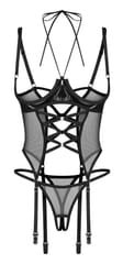 Zmysłowy Zestaw: Połyskujący Gorset z Otwartymi Miseczkami i Stringi z Otwartym KrokiemOdkryj elegancki i odważny zestaw bielizny, który łączy w sobie klasę, zmysłowość i uwodzenie.Komplet składa się z gorsetu wykonanego z połyskującego materiału i transparentnej siateczki, które wspólnie optycznie modelują sylwetkę, podkreślając talię i biust.Fiszbiny pod biustem zapewniają idealne uniesienie i stabilność, a otwarte miseczki subtelnie eksponują piersi, nadając całości niezwykle zmysłowego charakteru.Z przodu znajduje się ozdobne wiązanie na dekolcie i szyi, które dodaje drapieżnego uroku.Zestaw uzupełniają regulowane paski do pończoch oraz stringi z otwartym krokiem, tworząc pełną, kuszącą stylizację.Najważniejsze cechy:• Zestaw: gorset i stringi z otwartym krokiem• Fiszbiny pod biustem – zapewniają podtrzymanie i podkreślenie kształtu• Otwarte miseczki – dla odważnego, zmysłowego efektu• Ozdobne wiązanie na dekolcie i szyi• Regulowane paski do pończoch• Materiały:Gorset – 100% poliuretan (materiał 1); 76% poliamid, 24% elastan (materiał 2)Stringi – 76% poliamid, 24% elastan• Zaprojektowany w UEOstrzeżenie: Produkt nieodpowiedni dla dzieci poniżej 3 roku życia – ryzyko zadławienia z powodu małych części, które mogą się odłączyć od produktu.