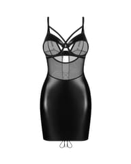 Dominna – Koszulka i Stringi z Imitacji Skóry i SiateczkiPoczuj się pewnie i zmysłowo w komplecie Dominna, który łączy drapieżny charakter imitacji skóry z delikatnością transparentnej siateczki.Zestaw składa się z dopasowanej koszulki oraz stringów, tworząc harmonijną i niezwykle seksowną całość.Koszulka o przylegającym kroju z tylnym sznurowaniem doskonale podkreśla talię i dopasowuje się do sylwetki.Fiszbiny pod biustem modelują i unoszą piersi, a paseczki w dekolcie dodają całości odważnego, dominującego wyglądu.Dopasowane stringi stanowią idealne uzupełnienie zestawu, podkreślając jego charakter.Najważniejsze cechy:• Zestaw: koszulka + stringi• Fiszbiny pod biustem – zapewniają idealne podtrzymanie• Połączenie imitacji skóry i siateczki – kontrast elegancji i zmysłowości• Dopasowany krój – podkreśla talię i kobiece kształty• Zmysłowe sznurowanie z tyłu – dla regulacji i uwodzicielskiego efektu• Koszulka – materiał 1: 100% poliuretan; materiał 2: 76% poliamid, 24% elastan• Stringi: 76% poliamid, 24% elastan• Zaprojektowano w UEOstrzeżenie: Produkt nieodpowiedni dla dzieci poniżej 3 roku życia – ryzyko zadławienia z powodu małych części, które mogą się odłączyć od produktu.