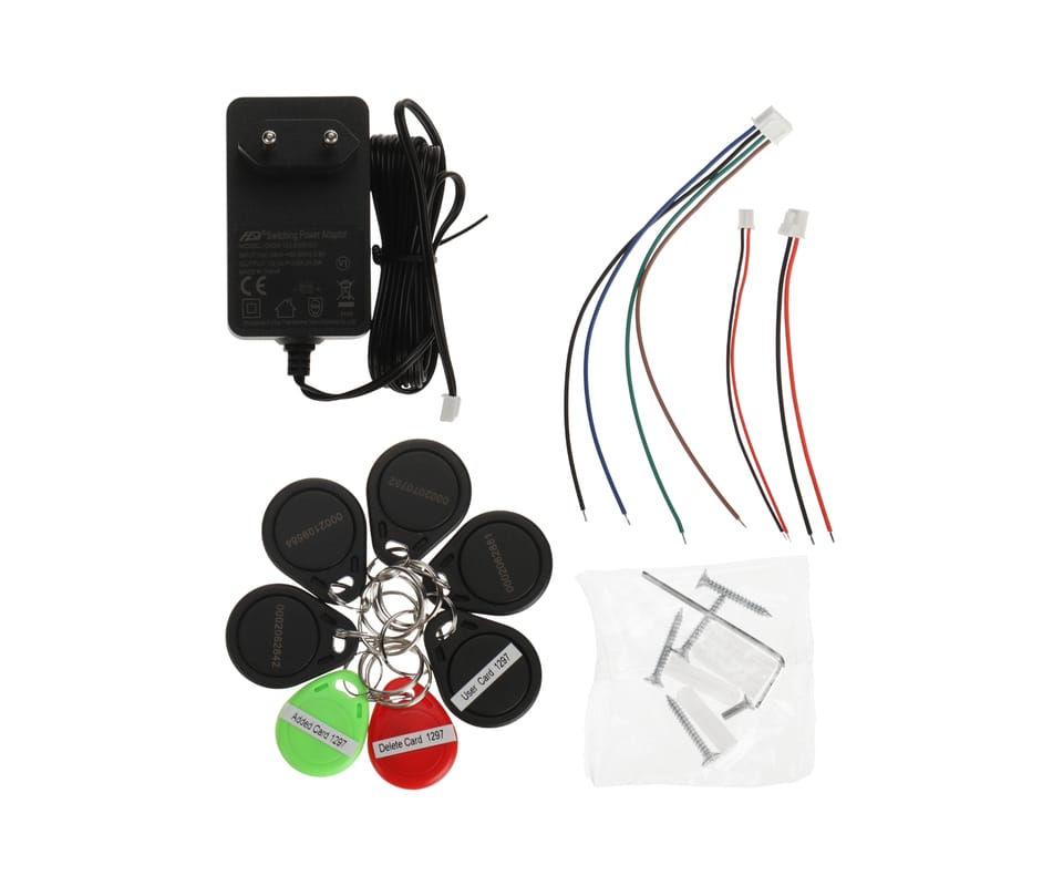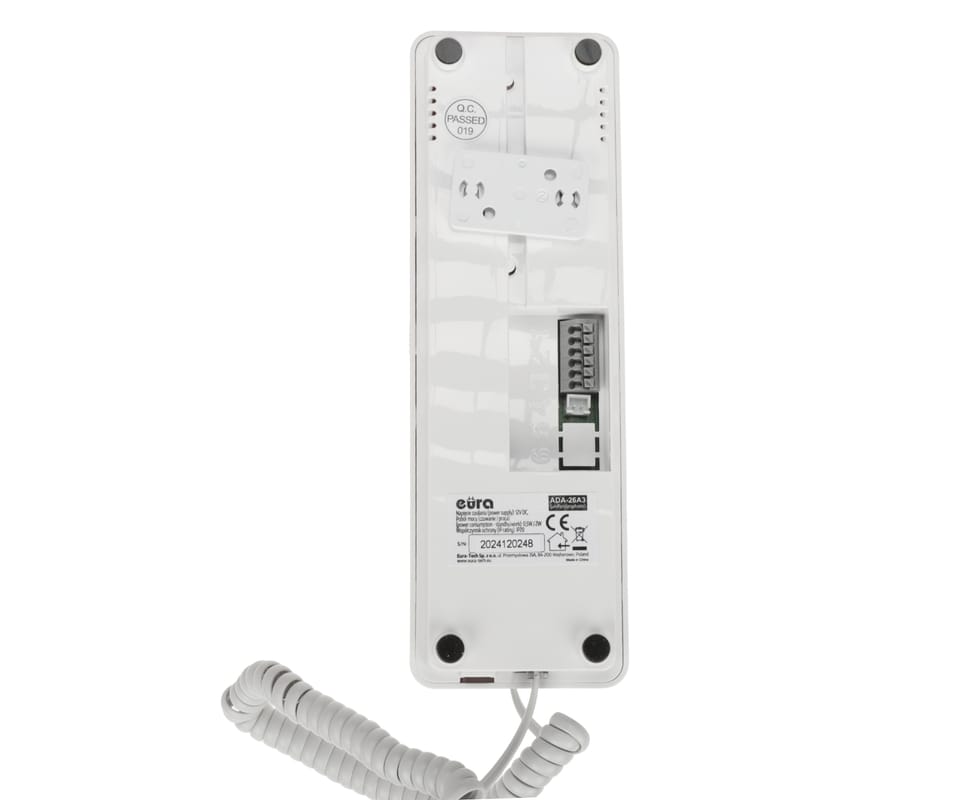 Jednorodzinny domofon "Eura" ADP-25A3 składa się z unifonu, kasety zewnętrznej i zasilacza sieciowego DC 12V.