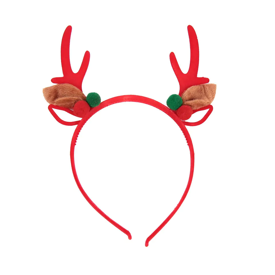 Świąteczna czerwona opaska do włosów z rogami renifera.