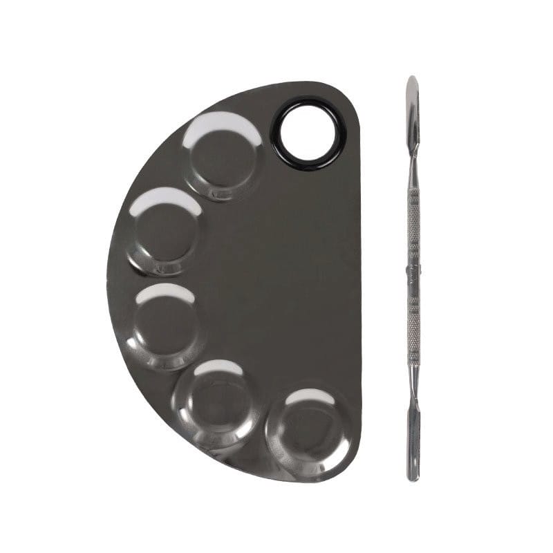 Paletka do mieszania kosmetyków wykonana ze stali nierdzewnej z dołączoną dwustronną szpatułką. Na paletce można mieszać kosmetyki takie jak podkłady, korektory, kosmetyki kremowe i półpłynne.