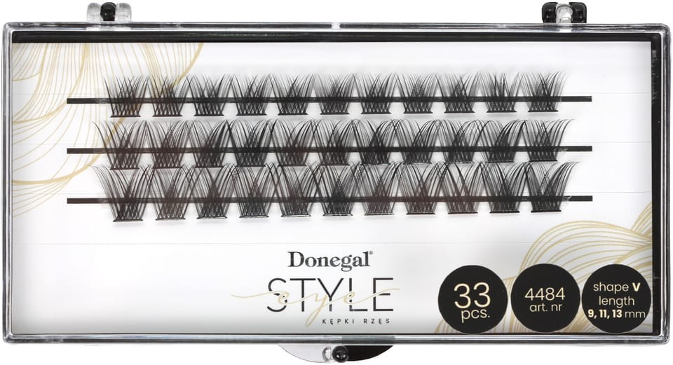 Kępki sztucznych rzęs Donegal Eye Style w kształcie litery V to doskonały sposób na podkreślenie spojrzenia, dodając rzęsom objętości i długości bez efektu ciężkości.